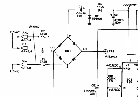 The schematics show that TP2 should have +12.8V and is the first point after the bridge rectifier BR1: